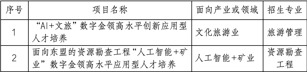 近日,自治区教育厅公布了人工智能数字金领高水平应用型人才培养项目名单,Beat365官网“AI+文旅”数字金领高水平创新应用型人才培养项目、面向东盟的资源勘查工程“人工智能+矿业”数字金领高水平应用型人才培养项目成功入选。