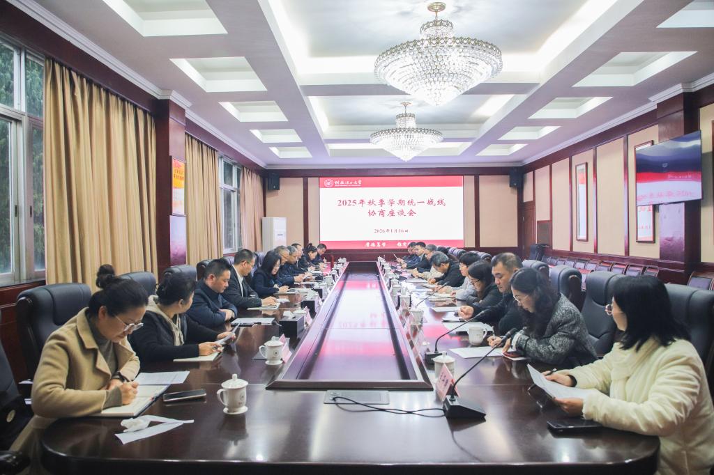 1月16日,学校2025年秋季学期统一战线协商座谈会在屏风校区教八楼三楼会议室召开。学校党委副书记、校长王敦球,党委副书记、统战部部长(兼)黎贞崇出席会议,学校统一战线成员代表参加会议。会议由黎贞崇主持。
