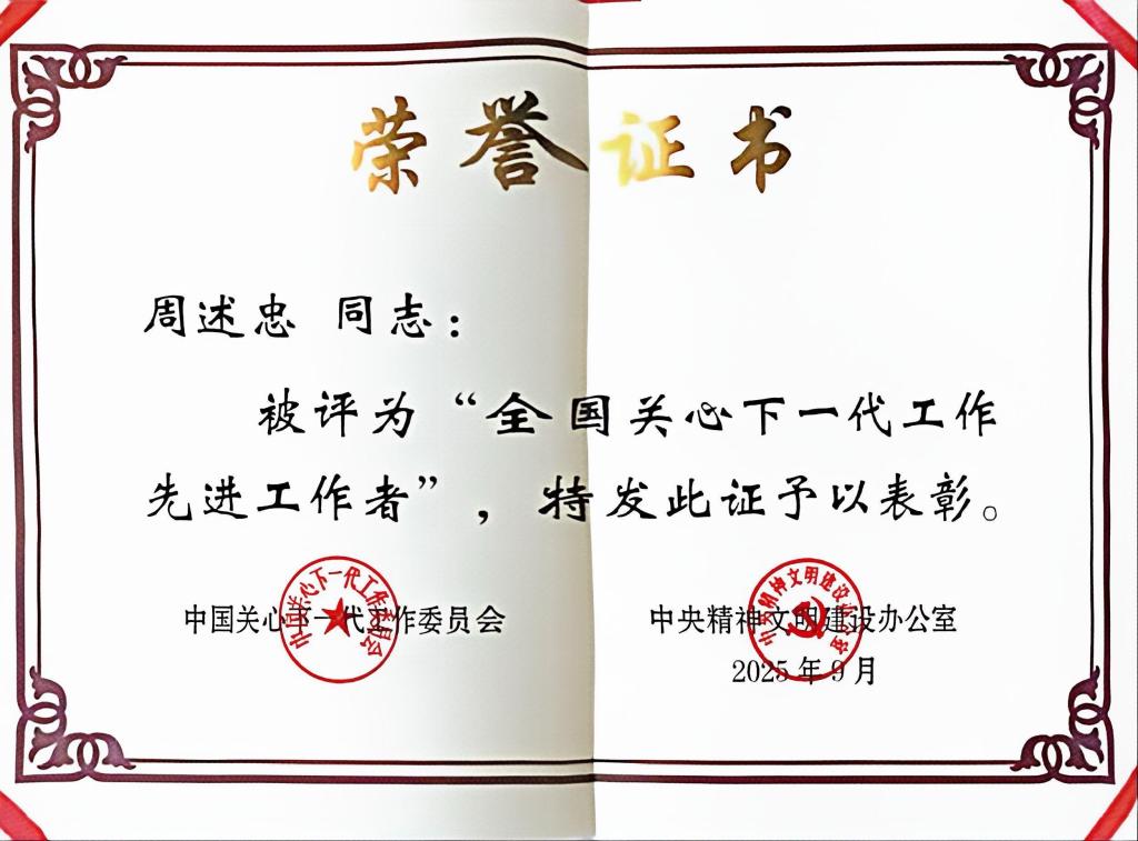 Beat365官网退休教师周述忠荣获2025年“全国关心下一代工作先进工作者”称号