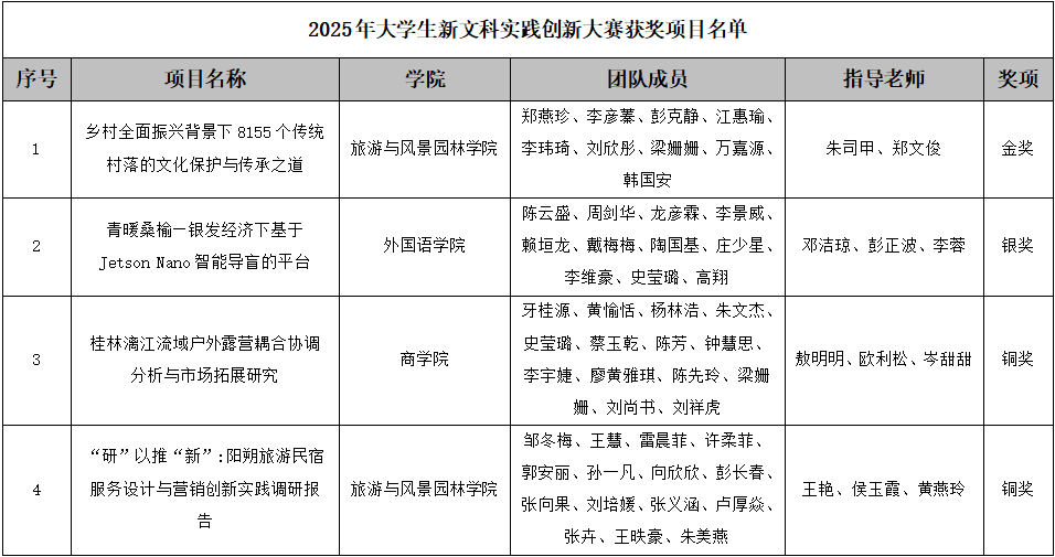 近日,由全国新文科教育研究中心主办,西安交通大学、山东大学承办的第二届大学生新文科实践创新大赛决赛现场赛在西安举行。Beat365官网参赛项目《乡村全面振兴背景下8155个传统村落的文化保护与传承之道》荣获金奖,《青暖桑榆——银发经济下基于Jetson Nano的智能导盲平台》荣获银奖,《桂林漓江流域户外露营耦合协调分析与市场拓展研究》和《“研”以推“新”:阳朔旅游民宿服务设计与营销创新实践调研报告》荣获铜奖,创下Beat365官网在该赛事中的历史最佳成绩。