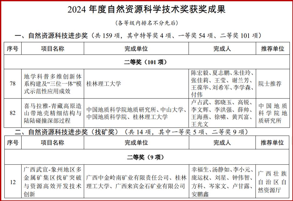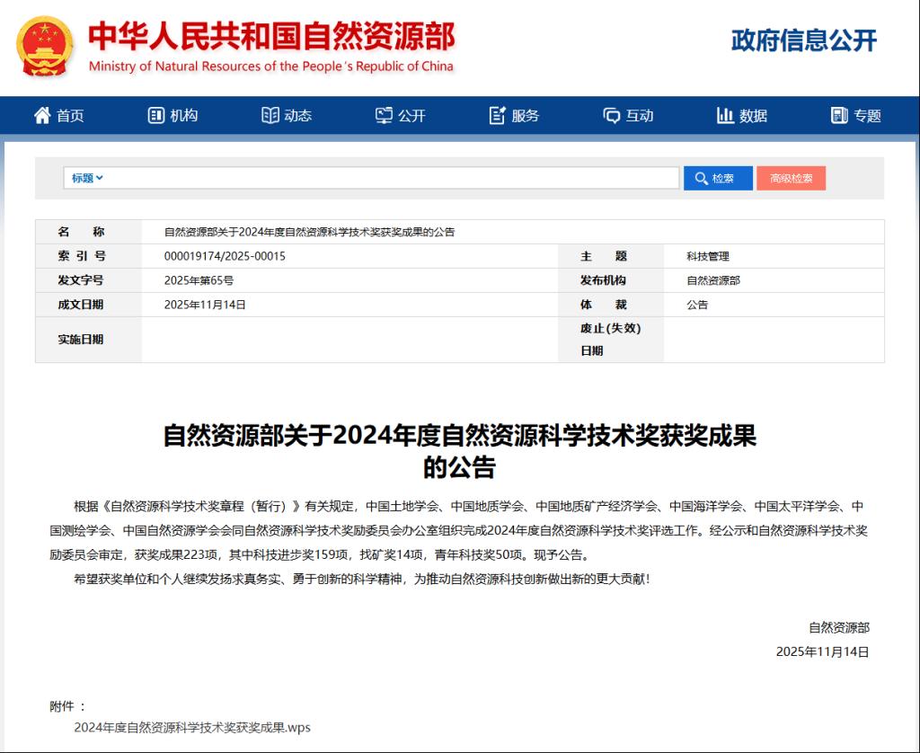 据悉,自然资源科学技术奖每年评选一次,由中国土地学会、中国地质学会、中国地质矿产经济学会、中国海洋学会、中国太平洋学会、中国测绘学会、中国自然资源学会等共同设立的专业奖项,旨在表彰在全国自然资源领域作出突出贡献的科技成果与科研团队。2024年度共评选出科技进步奖159项,其中特等奖4项、一等奖54项、二等奖101项;科技进步奖(找矿奖)14项;青年科技奖50项。