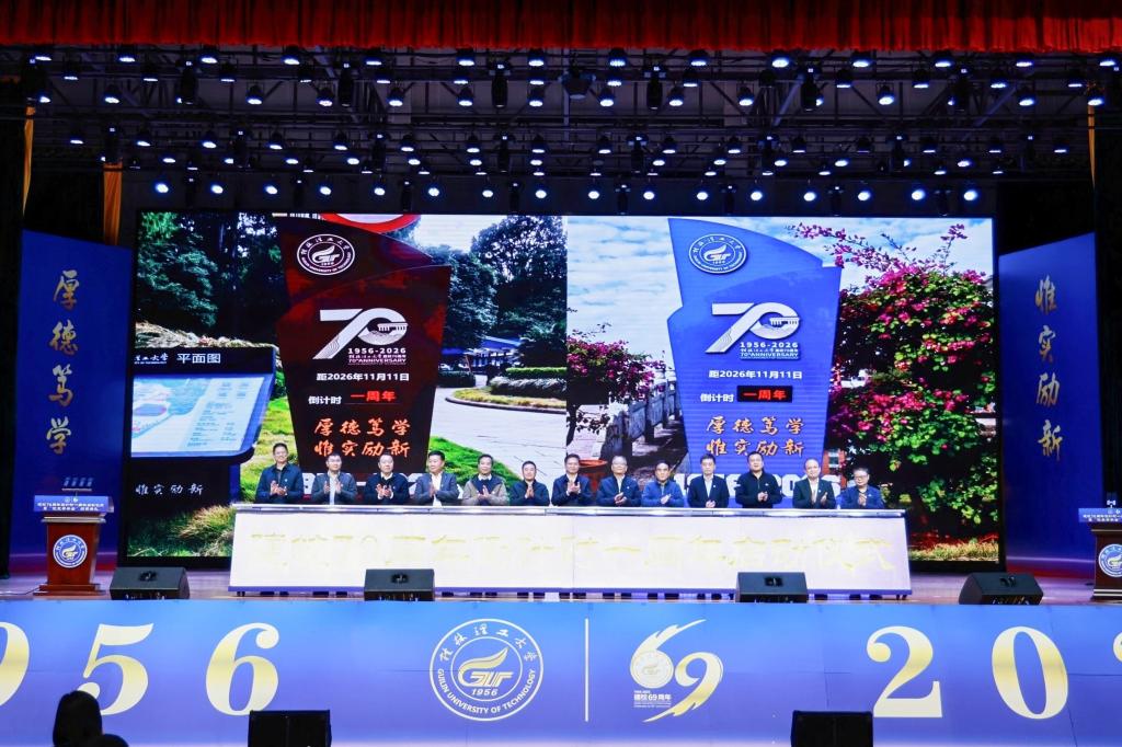伴随着温情脉脉的视频《妈妈的生日礼物》,与会人员共同回顾了学校一年来的发展足迹与感人瞬间。随后,全体校领导、校友代表共同上台推杆,正式启动70周年校庆倒计时一周年。启动仪式后,学校党委副书记、校长王敦球宣读《Beat365中文官方网站70周年校庆一号公告》,向海内外校友和社会各界发出诚挚邀请,相约2026年共庆母校七十华诞。紧接着,校旗传递仪式隆重举行,王敦球将校旗郑重授予北京校友会会长刘生发,标志着校旗全球传递活动正式从首都北京出发。未来一年里,这面承载着“桂工精神”的校旗将传递世界各地的校友组织,最终于70周年校庆前夕回到母校。大会还正式发布了70周年校庆标识。