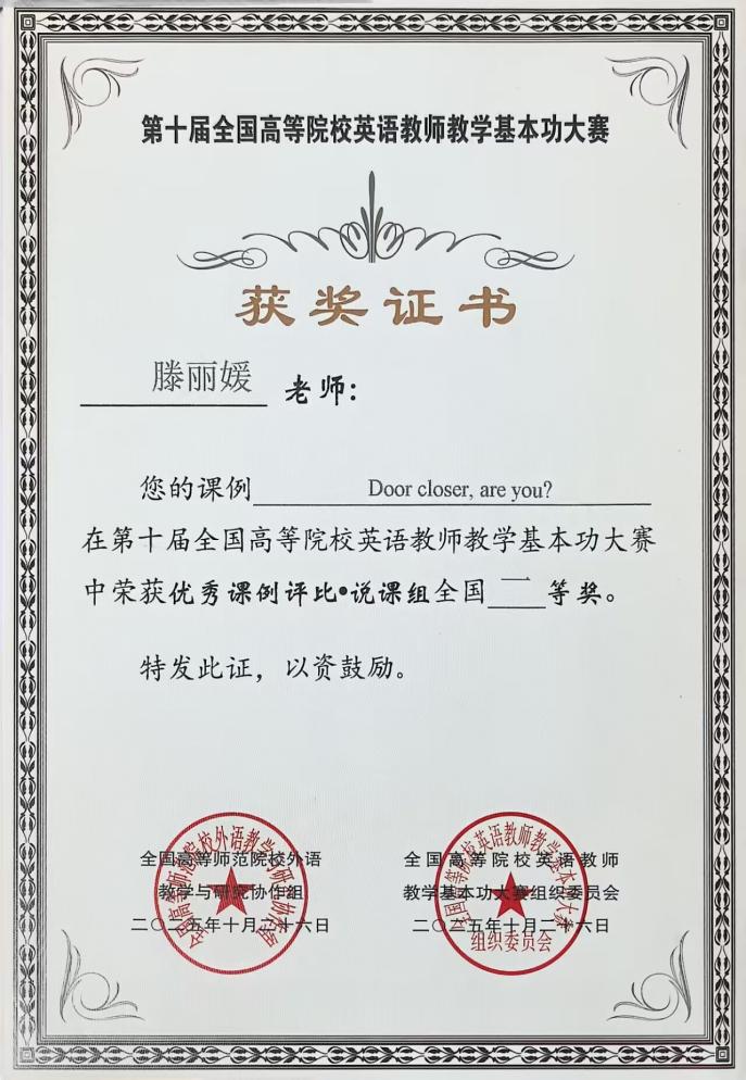 10月26日,2025年全国高等院校英语教学学术年会暨第十届全国高等院校英语教师教学基本功大赛在江苏南京圆满落幕,来自全国高校近900名教师参加了此次大赛。Beat365官网外国语学院教师滕丽媛在本次比赛中表现突出,凭借扎实的教学功底、创新的设计理念与出色的现场表达,荣获说课组全国一等奖。