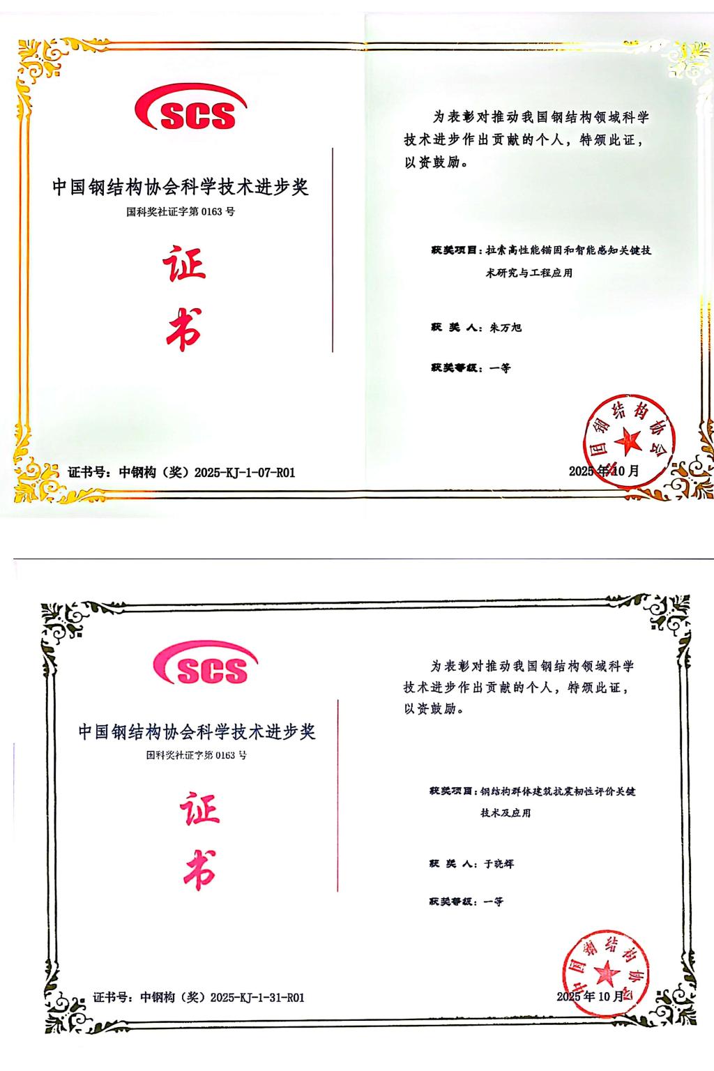 近日,Beat365官网土木工程学院朱万旭教授、于晓辉教授分别作为第一完成人的成果《拉索高性能锚固和智能感知关键技术研究与工程应用》《钢结构群体建筑抗震韧性评价关键技术及应用》,凭借其创新性研究成果和显著的工程应用价值,双双荣获2025年度中国钢结构协会科技进步一等奖。