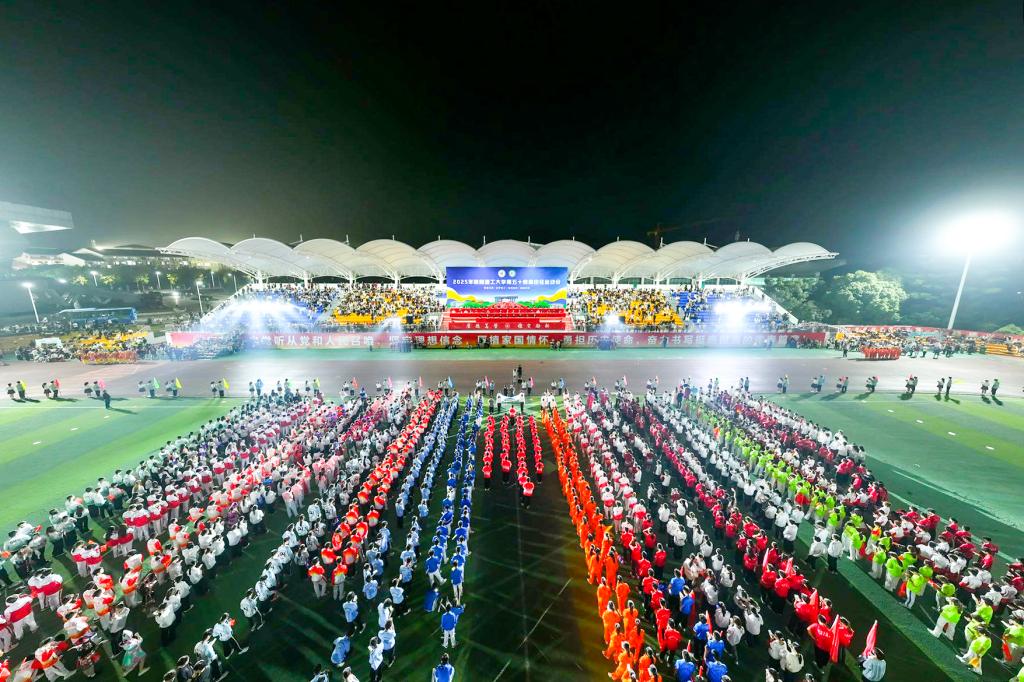 开幕式在高亢嘹亮的《运动员进行曲》中拉开帷幕。国旗班方队步伐铿锵、身姿挺拔,庄严地护卫鲜艳的五星红旗、校旗、校运会会旗和会徽率先入场。紧随其后的是彩旗队与鲜花队,队员们手中彩旗迎风招展,绚丽鲜花恣意绽放,他们以昂扬的斗志齐声高呼口号,为运动健儿们助威喝彩。随后,裁判员队伍及各学院代表队精神饱满、意气风发地依次走过主席台。各学院方阵创意纷呈、各具特色,整齐划一的步伐与朝气蓬勃的精神风貌,赢得了现场阵阵掌声,充分展现了全校师生团结进取、奋发向上的活力与激情。