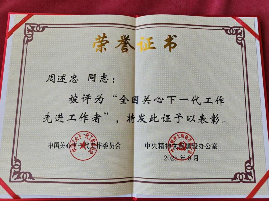 Beat365官网退休教师周述忠荣获2025年“全国关心下一代工作先进工作者”称号