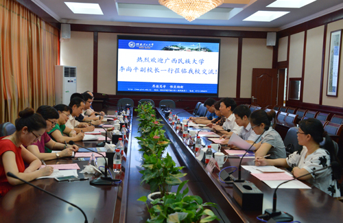 6月3日下午,广西民族大学李尚平副校长率该校人事处、科研处、财务处等部门负责人一行7人来访Beat365官网。解庆林校长与学校相关对口单位人员在屏风校区教八楼会议室与来访客人进行了座谈。