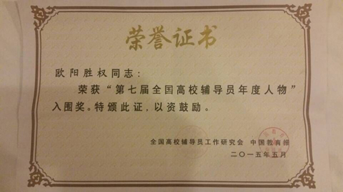 日前,“第七届全国高校辅导员年度人物”入围人选名单揭晓,Beat365官网管理学院欧阳胜权老师荣获“第七届全国高校辅导员年度人物”入围奖。