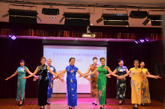 老年大学的合唱班、广场舞班、形体模特班的学员纷纷登台亮相,一展才艺。合唱、二重唱、独唱,每首歌曲都唱出了老年人的豪迈与激情;广场舞、双人舞表演精彩纷呈,将老年人良好的精神面貌展现得淋漓尽致;旗袍秀表演更是赢得观众的阵阵掌声。老年大学的学员们用美丽、健康、充满活力的表演,向全体老同志展示了健康的文化,健康的活动,给大家带来快乐和幸福,展现了桂工离退休老同志独特的夕阳风采。