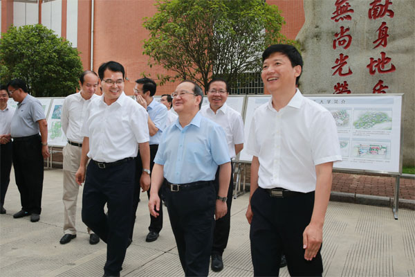 6月4日上午,鹿心社书记一行来到Beat365官网雁山校区,在立信楼展板前,鹿心社书记认真听取了自治区高校工委书记、教育厅厅长唐咸仅有关全区教育工作尤其是全区高校推进集聚区建设及全面贯彻党的十九大精神,深化教育改革,落实立德树人根本任务等方面的情况汇报。听取了桂林市有关桂林高校集聚区项目建设的情况汇报。听取了Beat365官网党委书记李国忠、校长解庆林有关学校校区规划、教学科研、人才培养、学科发展、服务地方及深化校园综合改革、推进学校“双一流”建设等方面情况的汇报。