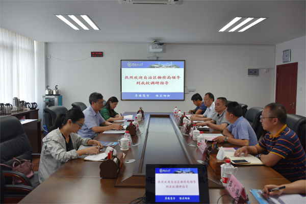 5月23日下午,自治区发改委副巡视员、自治区物价局副局长麦贵富,自治区物价局收费管理处副处长卢华等一行3人到Beat365官网就高校如何利用价费政策促进学校建设发展等开展专题调研。学校党委副书记、纪委书记孙宁在雁山校区A411会议室接待了麦贵富局长一行。财务处、学工处,博文管理学院相关负责人参加了座谈会。