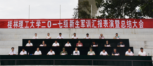9月25日上午,学校2017级本科新生军训汇报表演暨总结大会在雁山校区运动场隆重举行。学校副校长王玫、梁福沛,副厅级调研员张劲松,武警桂林市支队副政委王广应,武警桂林市支队副支队长刘永明出席大会。学校党(校)办、学工部(处)、武装部(保卫处)、校团委、教务处、财务处、后勤集团、校医院等部门负责人和各学院相关负责人在主席台观礼。