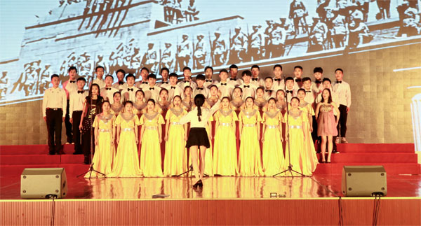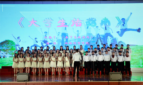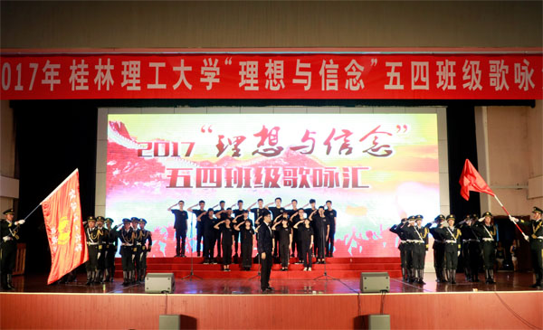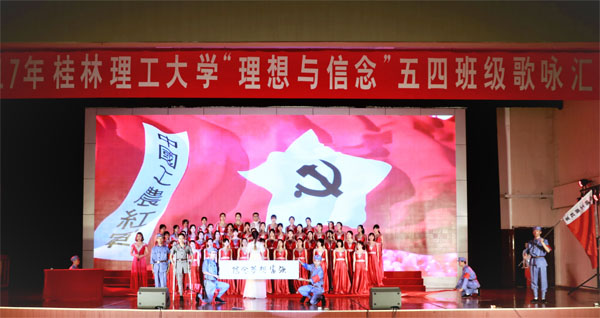 比赛在国旗班铿锵有力的歌声中拉开序幕。环境科学与工程学院演唱的《国际歌》雄壮嘹亮、气势磅礴,唱出了革命志士们不屈的气节;管理学院的《映山红》旋律优美,表达了人们对红军的崇拜与热爱;机械控制与工程学院演唱的《走向复兴》曲调昂扬向上,振奋人心,传递了中华民族渴求民族复兴、期盼国家富强的热切愿望。理学院带来的《大地之约》将演唱与表演相融合,演员们华丽的服饰和新奇的道具给观众带来了耳目一新的视觉享受;旅游学院演唱的《相亲相爱》将同学们的自我风采和青春活力表现得淋漓尽致;地球科学学院改编的歌曲《大学生活指南》诙谐幽默的曲风、生活化的歌词,富有创新精神的演唱形式,一度将晚会推向高潮;艺术学院的《苏联歌曲联唱》温婉动人、满怀深情;人文社会科学学院演唱的《飞来的花瓣》宛如黄莺,清丽动人,久久回荡在雁山宁静的夜空里。