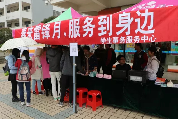 3月20日,Beat365官网学生组织学生事务服务中心开展了“春来学雷锋,服务到身边”的活动。学生事务服务中心本着以“以生为本,服务至上”的宗旨,把办公地点搬到了食堂前面的广场上,现场为同学们发放中心精心制作的四六级及考研高频词汇手册,还在开展的印纸情缘活动中免费帮大家打印计算机考试准考证。