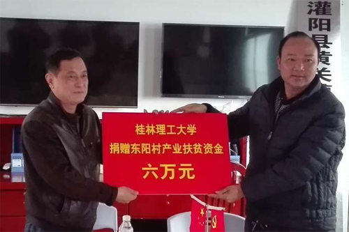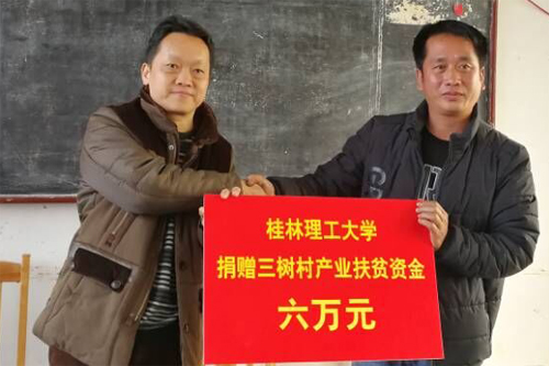 曾繁荣总会计师(左)代表学校向三树村捐赠六万元产业扶贫资金