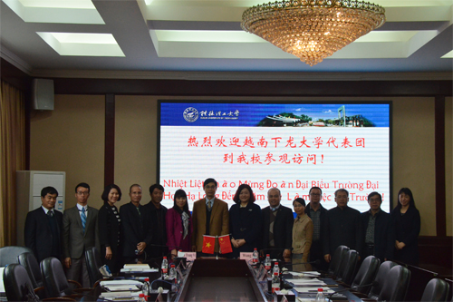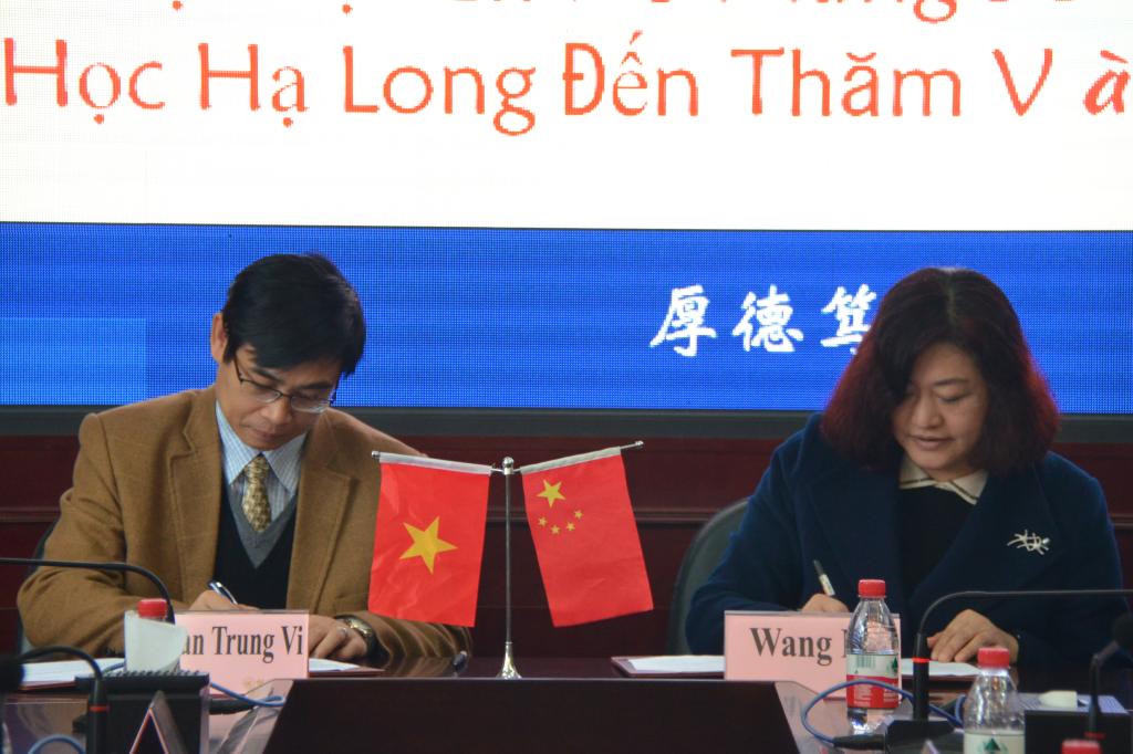王玫副校长(右)与越南下龙大学陈忠伟副校长(左)代表双方签署合作协议
