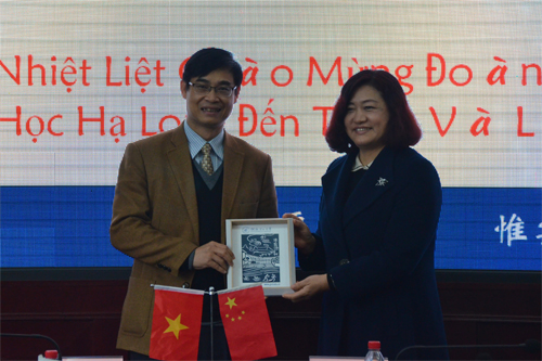 王玫副校长(右)与越南下龙大学陈忠伟副校长(左)代表双方互换礼物