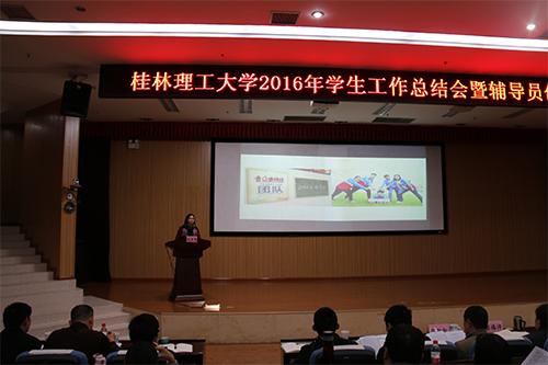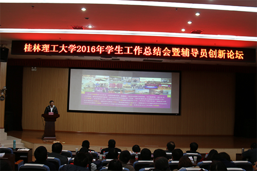 1月12日,学校在雁山校区图书馆报告厅举办2016年学生工作总结会暨辅导员创新论坛。学校副校长梁福沛、副厅级调研员张劲松出席会议,学工系统全体专兼职辅导员100多人参加会议。