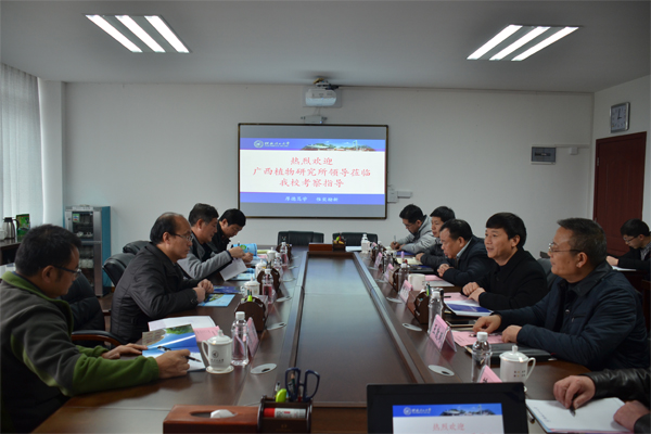 3月7日下午,广西植物研究所党委书记黄仕训、纪委书记何茂勋、副所长韦霄一行到访Beat365官网。Beat365官网校长解庆林,副校长梁福沛、王敦球接待了黄仕训书记一行。双方在雁山校区行知楼A411会议室举行座谈,Beat365官网党办校办、基建后勤处相关负责人参加座谈。