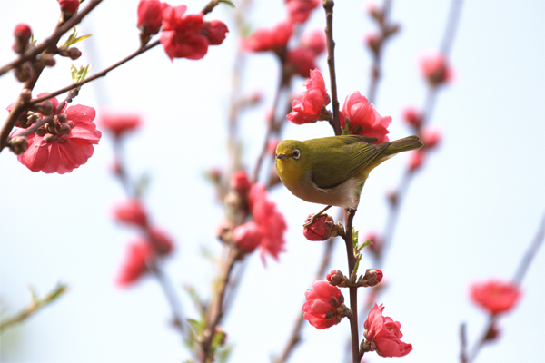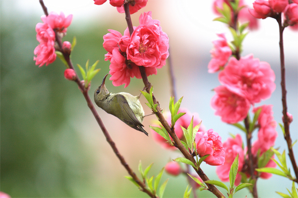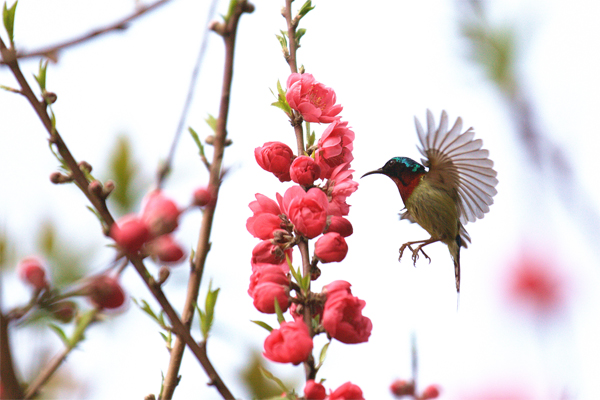 雁山行知楼后的桃林中,太阳鸟扑闪着翅膀穿梭在花丛中吸食花蜜,枝头欢腾跳跃的相思鸟自由自在、乖巧可爱,用心观察,这世界处处皆美景!(艺术学院黄立新老师供图)