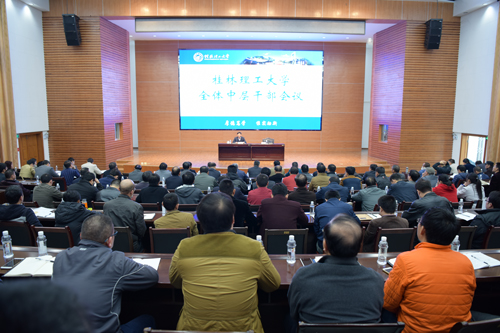 解庆林校长在会上首先代表学校对广大教职员工一年来为学校的建设发展所付出的辛勤劳动和无私奉献表示衷心感谢。随后,他回顾了在即将过去的2016年,学校各项事业取得的主要成绩,并实事求是地指出了学校建设发展中存在的问题和不足。他就做好2016年年末重点工作进行了全面安排部署:一是要认清形势,抢抓机遇,主动融入“双一流”建设大潮;二是要抓好学校教育事业“十三五”发展规划和各个专项、各学院规划的实施工作;三是要继续深化学校综合改革工作;四是要切实抓好人才工作;五是要抓好教学成果奖培育和申报工作;六是要认真抓好新一轮的博士点申报工作;七是要抓好科研工作;八是要抓好南宁分校工作;九是要抓好国际教育工作;十是要认真谋划抓好学生工作;十一是要加强和做好2016年度预算执行工作;十二是要抓好理事会的成立工作;十三是要做好年终几大考核工作;十四是要提前谋划抓好假期基建项目和一些零星维修改造项目工作。