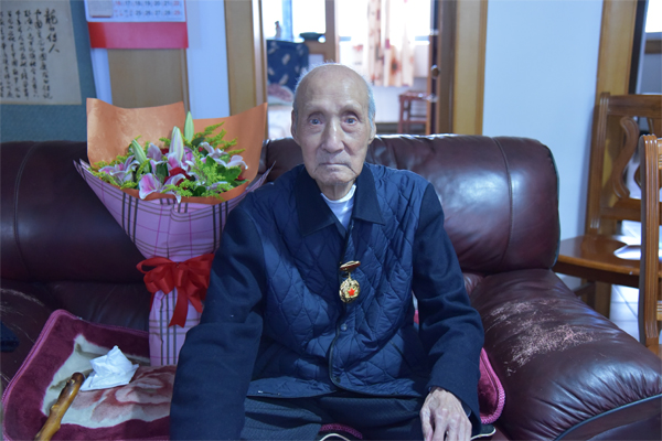柳林同志高兴地戴上“中国工农红军胜利80周年纪念章”