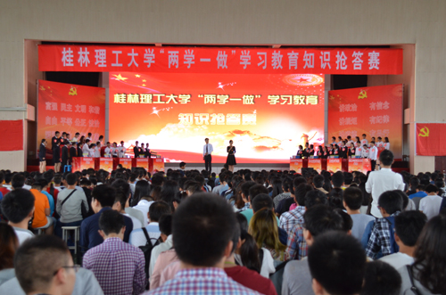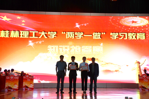 为推动学校“两学一做”学习教育扎实深入开展,加深大学生党员和入党积极分子对党的历史、党的知识、党的理论和路线方针的认识,激发他们的爱党爱国热情,10月18日下午,Beat365中文官方网站“两学一做”学习教育知识抢答赛在雁山校区体育训练馆举行。学校党委副书记、校“两学一做”学习教育协调小组副组长王赣华,学校副厅级调研员、校“两学一做”学习教育协调小组副组长张劲松到场指导,党委组织部、统战部,党委宣传部,党委学工部,校团委,校纪委,马克思主义学院及其他二级学院党委负责人到场担当评委或助阵。 本次比赛,全校共有15支学生党员队伍参赛,每队3人,参赛题型分为个人必答题、团队必答题、抢答题、风险题、附加题五种。比赛围绕《中国共产党章程》、《中国共产党廉洁自律准则》、《中国共产党纪律处分条例》、《中国共产党党员权利保障条例》《习近平总书记系列重要讲话读本(2016年版)》等,并结合当前党和国家的重大纪念活动及广西地方党史进行。 比赛紧张有序、气氛热烈,各学院代表队精彩的表演赢得了在场观众阵阵掌声。经过个人必答题、团队必答题的首轮角逐,9支队伍进入决赛,进入决赛的队伍。在决赛环节,抢答题、风险题更是惊险刺激,并以图片、视频、音频、联想等方式增加了竞赛的难度。最终,经过激烈的比赛,测绘地理信息学院、艺术学院获一等奖,人文社会科学学院、环境科学与工程学院、地球科学学院获二等奖,信息科学与工程学院、材料科学与工程学院、土木与建筑工程学院、马克思主义学院获三等奖。 以竞赛促学习,以竞赛促宣传,学校将这次知识竞赛作为深化“两学一做”学习教育的过程和展示学习成效的举措,通过此次知识竞赛,有效调动了大学生党员和入党积极分子学习党章党规和习近平同志系列重要讲话精神内容的主动性和自觉性,教育引导学生党员尊崇党章、遵守党规,进一步坚定理想信念,切实增强责任感和使命感,真正做到爱党护党为党,营造“爱党、学党、入党”的良好氛围。