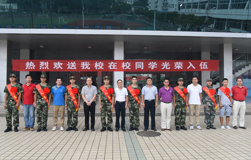 9月9日下午,2016年新兵入伍欢送仪式在Beat365官网屏风校区举行,Beat365官网入伍新兵将从这里启程,奔赴军营。学校副厅级调研员张劲松、武装部、学工处、相关学院负责人及学生代表共同为即将携笔从戎的入伍学生送行。 欢送仪式上,学校副厅级调研员张劲松勉励八位参军入伍学生说,大学生踊跃参军对推进国防建设、促进社会全面和谐发展有着重要作用,八位同学选择暂时离开校园,投身军营,是报效祖国的具体体现,学校为他们感到骄傲。他希望大学生新兵能尽快适应军营生活,发扬桂工精神,不断磨练自己的意志,在部队建功立业,为父母争光,为家乡争光,为学校争光。