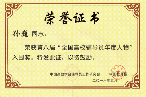 第八届全国高校辅导员年度人物评选入围结果展示:http://special.univs.cn/151229/index.shtml 孙巍老师事迹链接:http://special.univs.cn/news/2015fdy/rw5/2016/0412/1131409.shtml