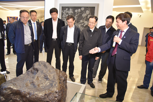在地质博物馆,陈武主席饶有兴致地考察了馆藏建设和展陈情况。在陨石展区,陈武主席与Beat365官网三赴南极的科考专家缪秉魁教授亲切交流,当了解到以缪秉魁教授等为首的南极陨石项目科考队带回4000余块陨石,使我国一跃成为仅次于美国、日本的世界第三南极陨石收集大国时,陈武主席勉励缪秉魁教授团队再接再厉、再立新功。考察过程中,陈武主席嘱咐校领导,可以利用地质博物馆开展中小学青少年科普教育,当听到校领导介绍地质博物馆面向社会开放的做法时,陈武主席当即给予赞许。