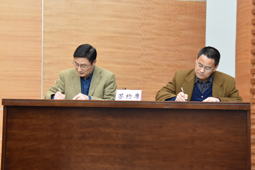 解庆林校长(左)与王敦球副校长(右)现场签订2016年党风廉政责任状