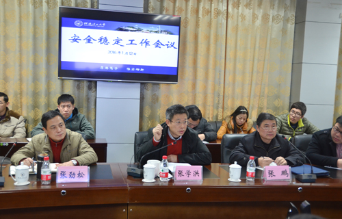 张学洪书记在讲话中指出,学校安全工作关系师生利益、学校发展和社会稳定,责任重于泰山。他就维护校园安全稳定提出三点意见,一是认清形势,深刻理解加强高校思想政治和意识形态工作的重要性;二是切实做好意识形态工作,维护校园安全稳定;三是建立健全考核和责任机制,切实抓好工作落实。张书记强调,各学院、各部门要认真学习传达会议精神,进一步统一思想、明确职责和工作任务,层层落实把各项安全稳定工作落到实处;各部门要做好日常异常情况的排查;要引导广大教师增强工作责任感,进一步加强课堂管理和教师队伍的管理;加强对学生思想政治教育和日常管理;做好寒假春节假期和涉外活动的管理;加强对安全稳定工作的组织领导,加强对安全稳定的宣传教育,开展专项排查,层层抓好落实。他希望各学院、各部门以更加严谨的作风、更加科学的方法、更加得力的措施、更加精细的管理,确保校园安全稳定,积极创造安全文明、祥和有序的校园环境和工作氛围,为学校科学快速健康发展作出新的更大贡献。
