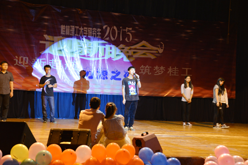 10月16日晚19:30,2015年研究生迎新生文艺晚会在南校区礼堂举行,晚会现场欢歌笑语、气氛热烈。学校副校长陈学军、周国清到会,党委研究生工作部、研究生院、党委宣传部、校团委以及各二级学院主管研究生教育领导、研究生教学秘书、研究生辅导员与广大研究生一起观看了晚会。