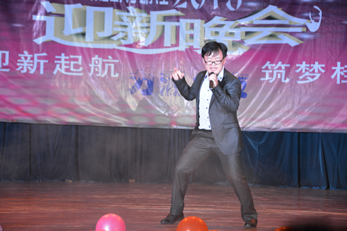 晚会还邀请了东华理工大学研究生院党委副书记许亚男作为嘉宾登台献艺。许亚男副书记先后表演了模仿秀,演唱了《美了美了》,并在现场观众的热情邀请下又加唱了《小苹果》等歌曲,他激情澎湃的演唱、诙谐幽默的语言、热情似火的舞蹈赢得了在场观众一次又一次的掌声,喝彩声响彻全场,将晚会推向了高潮。