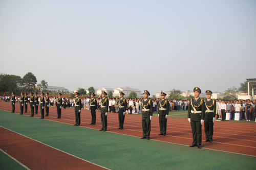 在全校师生的注目礼下,英姿飒爽的国旗护卫队队员们迈着整齐的步伐,护送鲜艳的五星红旗进场。伴随着庄严雄壮的中华人民共和国国歌的奏响,鲜艳的五星红旗缓缓升起,全场师生肃立,凝视着飘扬升起的五星红旗,表达对祖国无限的热爱和崇高的敬意。
