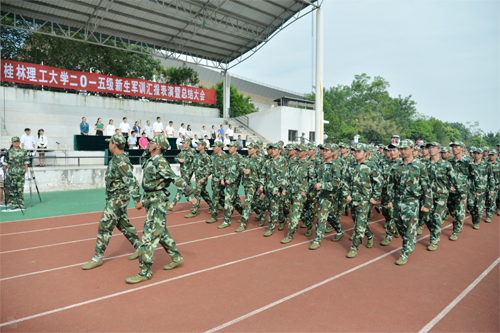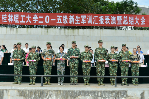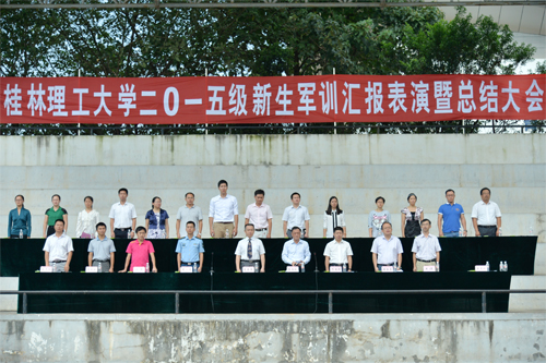 追逐着9月的和风,沐浴着金秋的阳光,9月30日上午,2015级本科新生军训汇报表演暨总结大会在雁山校区运动场隆重举行。学校副校长肖岳峰、副厅级调研员张劲松,95389部队副参谋长朱一鸣少校出席大会。学校党(校)办、宣传部、学工部、武装部、校团委、教务处、后勤处等部门负责人和各学院相关负责人在主席台观礼。大会由学校武装部部长、保卫处处长、军训领导小组副组长崔光仁主持。