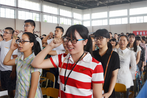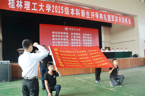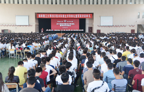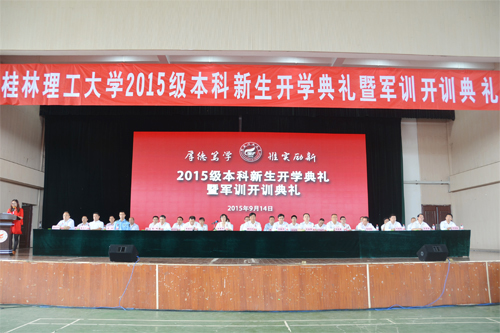 9月14日上午,学校在雁山体育馆隆重举行2015级本科新生开学典礼暨军训开训典礼。在家校领导学校校长解庆林,党委副书记王赣华,党委副书记、纪委书记陈贵英,副校长周国清、王敦球,正厅级调研员张鹏,副厅级调研员张劲松,承训部队代表、中国人民解放军某部政治处主任李明少校,2015级全体本科新生,学校相关职能部门和各学院负责人,教师代表,老生代表以及2015级本科生辅导员和班主任参加了典礼。典礼由陈贵英副书记主持。 典礼在庄严的国歌中拉开序幕。学校校长解庆林教授在典礼上作了热情洋溢的讲话。他首先代表学校全体师生员工向2015级新同学的到来表示热烈欢迎!随后向2015级新同学介绍了学校的辉煌历史、优良的办学传统和丰富的教学优势及特色。解校长引用去年习近平总书记在北京大学座谈会时 “扣扣子”的比喻告诫大家:“青春处在价值观形成和确立的时期,抓好这一时期正确价值观的养成十分重要。这就像穿衣服扣扣子一样,如果第一粒扣子扣错了,剩余的扣子都会扣错。人生的扣子从一开始就要扣好。”就如何开启大学生活,解校长向全体新生提出四点希望:一是希望同学们“明志”,明确目标,让梦想成为人生动力。二是希望同学们“修身”,锤炼品德,让德行成为人生追求。三是希望同学们“勤学”,勤于学习,让学习成为人生习惯。四是希望同学们“惜时”,珍惜时光,让惜时成为人生态度。对即将开启的军训生活,解校长指出,军训是Beat365官网按照教育部等上级部门规定要求确定的必修课程,希望同学们严格按照教官的要求认真完成好各项训练任务,继承解放军“一切行动听指挥”的优良传统,加强纪律性组织性;通过军训锻炼健康体魄,为更好地完成大学阶段学习任务打下良好基础。最后,解校长衷心地祝愿2015级新同学在Beat365中文官方网站谱写一曲美丽的青春之歌,成就自己别样精彩的快乐人生! 中国人民解放军某部政治处主任李明少校代表承训部队在军训开训典礼上作了动员讲话。教师代表、地球科学学院时毓老师,在校生代表、校学生会主席钟广龙,新生代表、管理学院王洋同学先后在典礼上发言。 随后,全体2015级4347名本科新生进行了庄严的入学宣誓,从这一刻开始2015级本科生真正成为Beat365中文官方网站的一员,他们将在桂工这片沃土上成就自己的梦想,立志做有益于国家、有益于社会、有益于人民的栋梁之才。 最后,典礼在气势恢宏、令人振奋的校歌声中落下帷幕。