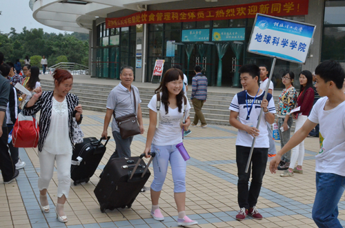 9月13日,学校校长解庆林、副书记陈贵英、副厅级调研员张劲松等校领导一行分别到到雁山校区各学院迎新大本营、绿色通道及财务缴费等地点检查指导迎新工作。在艺术学院迎新点,解庆林校长饶有兴趣地观看了学生的作品展示。在化生学院迎新点,来自来宾报到新生黄莹莹同学很“荣幸”地与解庆林校长一起在入学纪念墙前合影,留下了其一生难忘的回忆。“这个决心很好!”,在地学院新生寄语墙前,解庆林校长指着一名新生“绝不挂科”的留言说道。在环境学院迎新点,解庆林校长看到自己所带班级的学生纷纷来做志愿者很是高兴,他说,作为班主任,我只完成了“规定动作”,“自选动作”做得还不够!在土建学院迎新点,解庆林校长与来自浙江的新生家长攀谈,了解报到情况,希望他们对学校多提宝贵意见和建议。“校园很大,很漂亮!”新生家长说道。在绿色通道办理处,解庆林校长详细地询问了绿色通道办理情况,要求工作人员认真做好此项工作。在旅游学院女生宿舍和艺术学院女生宿舍,解庆林校长热情询问了新生的报到、住宿情况,详细了解了他们对学校的意见和建议,并叮嘱来自山东、山西新生及家长应对桂林“南风天”的注意事项。在机控学院男生宿舍,解庆林校长了解到负责“导学、导管、导助“的学长是一位科技“学霸”后,勉励他发挥自身优势,做好新生的服务与管理工作。