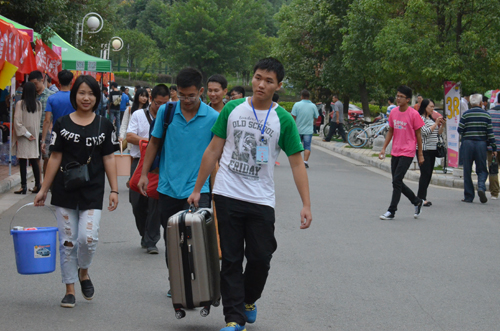行李箱的轮子碾过地面的声音不绝于耳,大一的新生从五湖四海汇入桂工这片知识的海洋里。在工作人员和志愿者的引导下,新同学们有条不紊地进行报到、注册,穿梭于宿舍与食堂,他们的大学生活从此开始。岁岁年年花相似,年年岁岁人不同。虽说每年的新生都怀抱着一腔热血,脸上混杂着风尘仆仆的艰辛和新奇憧憬,但今年记者在众多新生中,却也感受到了一股新风。往年新生身边常有家长前簇后拥地去搬行李、注册报到,今年独自一人去完成整个流程的新生人数明显多了起来。化工与制药15-4班的胡昊芸同学便是这样独立报到的新生中的一员,她说:不适应新环境也要强迫自己适应,走好大学开学第一步,为以后走出校园、走向社会打下基础,除了遵循父母的期望,好好学习,拿奖学金,他表示,还想好好准备考研,才能找到自己喜欢的工作。据记者了解,像胡昊芸同学这样有志考研的同学不在少数。来自艺术学院公共美术专业的林同学表示来到大学除了一定要参加社团和学生会锻炼能力之外,考研也是她心中的梦想。她希望能通过考研来不断提升自我,完善学历的不足,来追寻一片更广阔的天地。