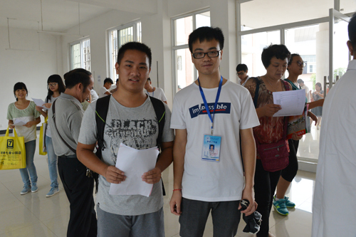 佩戴学长制工作证上岗的大三学长正陪同和他结对的新生办理入学手续