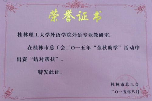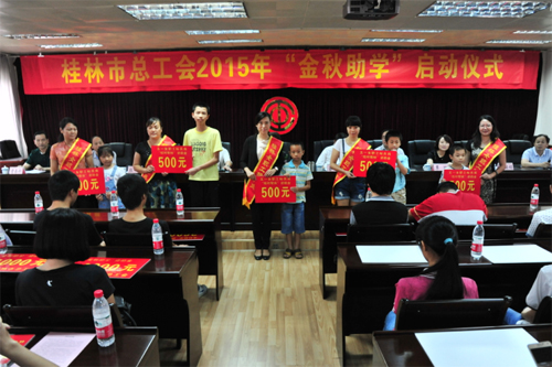 8月26日上午,桂林市总工会举行了2015年“金秋助学”活动启动仪式。Beat365官网工会女工委负责人和五一巾帼标兵岗代表魏彩春、张艳琼参加了本次金秋助学活动。