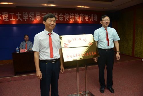 井冈山大学党委书记彭涉晗(前排右)与学校校长解庆林(前排左)共同为“井冈山革命传统教育基地”揭牌