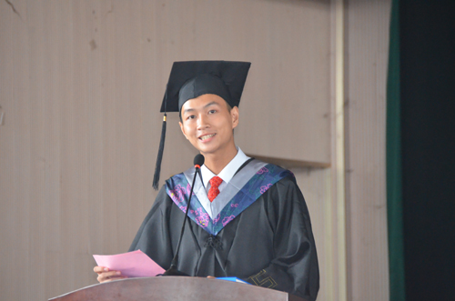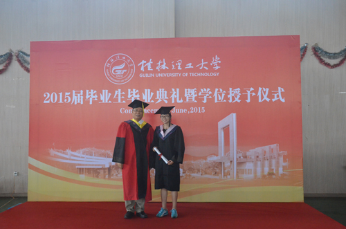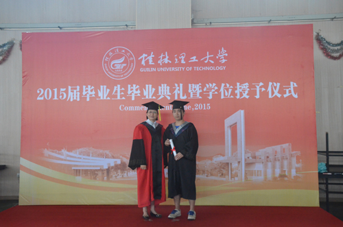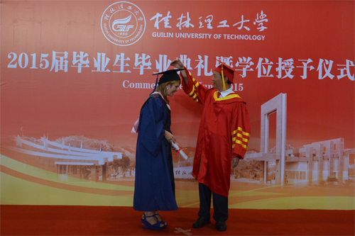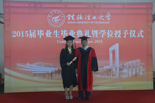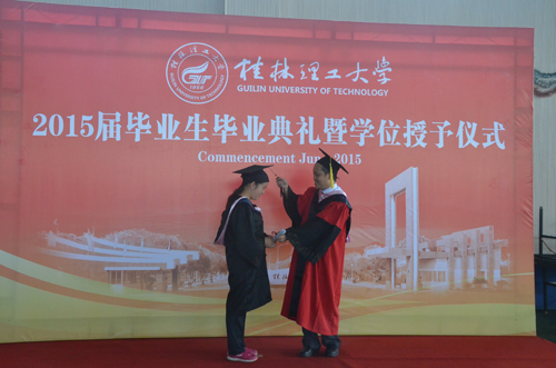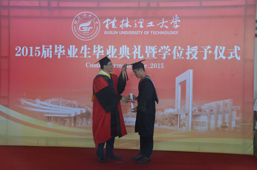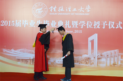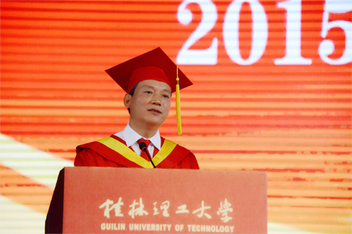 2014年度“中国大学生自强之星标兵”、旅游学院旅游管理专业本科毕业生甘书杰同学代表2015届毕业生发言,表达了对母校、师长的感恩之情和勇敢追求梦想,为母校争光,为社会发展贡献力量的信心和决心。广西五四青年奖章获得者、材料科学与工程学院龙飞教授代表学校教师发言,表达了对2015届毕业生的诚挚祝福和殷切期望。四川校友会会长、地质85届毕业生、成都金羽天翼体育运动有限公司董事长胡一平先生作为校友代表发言,他向毕业生们分享了自己多年来的经历与感悟,并提醒毕业生们要有一颗感恩之心,要有坚韧的毅力,勿以善小而不为,勿以恶小而为之。