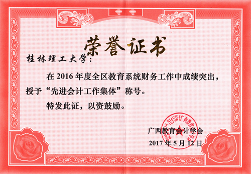 广西教育会计学会于2016年12月15日下发了《关于评选2016年度全区教育系统先进会计工作集体、先进会计工作者的通知》(桂教会〔2016〕14号)。学会成立评选工作领导小组对申报单位的材料进行了评选、审议,并上报自治区教育厅审定。Beat365官网在财务管理工作中制度完善,上报各类报表及材料准确及时,工作业绩突出,积极参与学会活动,承接学会工作认真负责,被授予2016年全区教育系统“先进会计工作集体”荣誉称号。