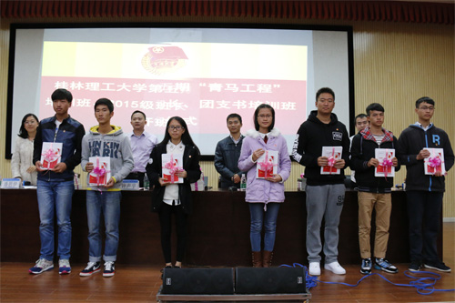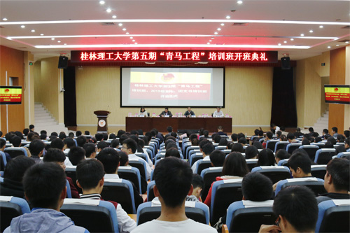 11月11日晚,学校第五期“青马工程”大学生骨干培训班、2015级班长团支书培训班开班典礼在雁山校区图书馆报告厅举行,共青团广西区委学校部部长钟声宇出席。校团委负责人、各学院团委负责同志和300余名学生骨干参加培训。 开班典礼在激昂的《光荣啊,中国共青团》中开幕,培训班负责老师分别就培训班的内容、形式和时间安排作了部署。随后,学员代表上台发言,表示一定会珍惜此次学习机会,认真完成培训班的内容,完善自身知识结构,努力使自己成为马克思主义的传承者、传播者。为丰富培训内容、提高培训针对性和实效性,学校团委专门为学员编印了《学校优秀团日活动汇编》、《团支部工作手册》等学习资料。此外,校团委还根据学员们的实际需求专门购买了一批经典名著,供培训班学员在1年的培训中借阅。学校团委负责人在开班典礼上阐述了新时期开展大学生骨干培养工程的背景、目的和意义,并对培训班和全体学员提出了要求和希望。当天恰逢学校59周年校庆日,全体师生齐唱校歌向59周年校庆献礼,开班典礼在嘹亮的校歌声中落下帷幕。 开班典礼结束后,共青团广西区委学校部部长钟声宇为全体学员作了题为《青年学生骨干的成长成才》专题报告。钟部长与同学们分享了自己大学期间学习生活和担任学生干部的工作经历,对广大学生干部提出了“选择、坚守、合作、创新、谦让”的工作要求,他希望学员们珍惜学习和实践的机会,努力成长为一名坚定的马克思主义者。
