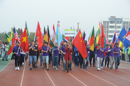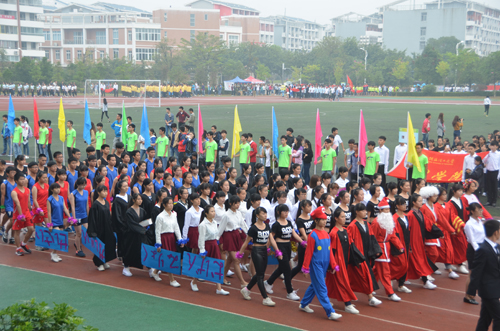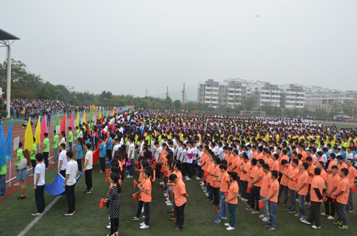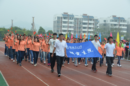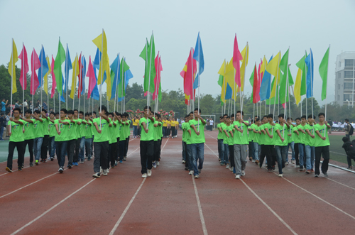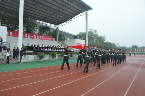 整齐的装束,坚毅的脸庞,伴随着阵阵欢呼声,国旗班迈着铿锵有力的步伐,庄严而又昂扬地护送五星红旗和校运会会旗进入会场。紧随其后的是五彩缤纷的彩旗队和充满青春活力的鲜花队,他们衣着鲜艳,意气风发,构成了整个会场最绚丽的风景。本届运动会就此拉开了帷幕。接踵而至的是各学院的方块队,他们响亮的口号、磅礴的气势,博得了满场的喝彩,展现了各学院的特色和桂工学子良好的精神风貌。