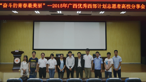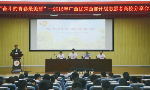 4月27日上午,“奋斗的青春最美丽”——2015年广西优秀西部计划志愿者分享会在Beat365官网雁山校区图书馆报告厅举行。共青团广西区委宣传部副部长谢建伟,Beat365官网团委负责人和Beat365官网200多名师生共同聆听了四位西部优秀志愿者的青春故事。