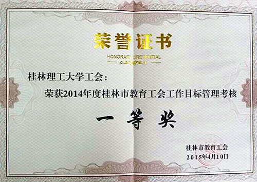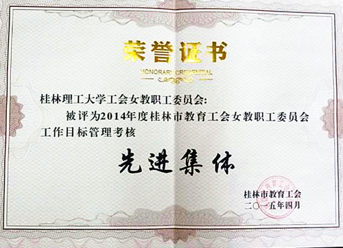 根据市教育工会《关于表彰2014年度桂林市教育工会工作目标管理考核先进集体的决定》(市教工字〔2015〕13号),我工会荣获2014年度市教育工会工作目标管理考核一等奖,校女教职工委员会获2014年度市教育工会女教职工委员会工作目标管理考核先进集体荣誉称号。