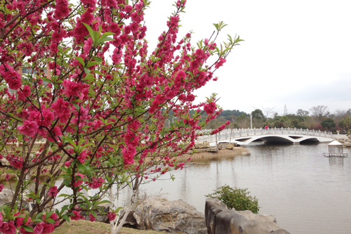桃之夭夭,微风拂过,映照拱桥,别样风姿。