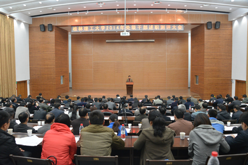 为进一步加强学校处级领导干部队伍建设,全面、客观、公正地考核Beat365官网处级领导干部的工作业绩及履职情况,1月26日,Beat365官网在屏风校区图书馆报告厅举行2014年度处级干部述职测评大会,在家校领导解庆林、王赣华、肖岳峰、陈学军、梁福沛、王敦球、张鹏出席大会,学校全体处级干部参加大会。